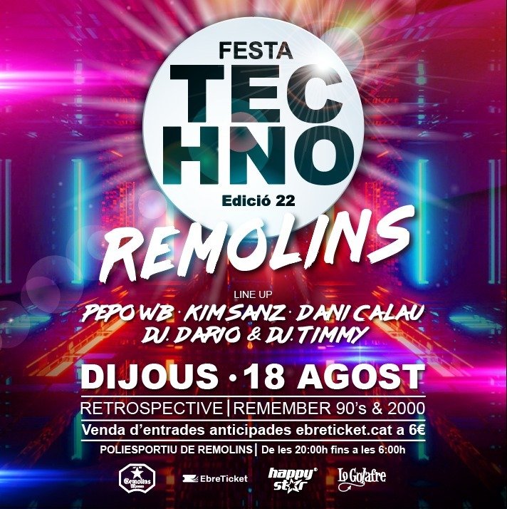Poliesportiu Remolins Carrer del Sindicat, 1, TortosaAquest any estarem promocionant un dels esdeveniments més importants dels últims temps. Una festa molt esperada per part de tots nosaltres. 3 anys han hagut de passar però per fi el 18 d'Agost la podrem disfrutar. Festa Techno de Remolins edició 2022 amb Pepo Wb, Kim Sanz, Dani Calau, Dj Dario & Dj Timmy. Compra […]