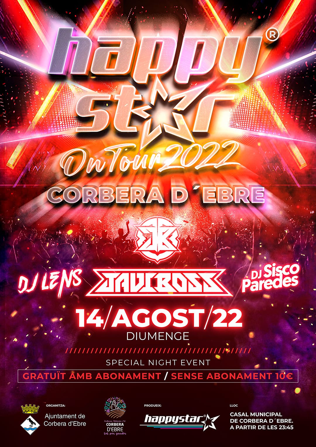 Casal Municipal Avinguda Casal, 10, Corbera d'EbreDiumenge 14 d'Agost Happystar on Tour 2022 farà parada a Corbera d'Ebre amb un cartell d'autèntic luxe!!! Més de dos anys esperant aquest festival què per fi podrem celebrar tots junts. Ens acompanyarà ni més ni menys un dels dj's amb més renom del panorama musical de tot l'estat.....JAVI BOSS!!! També tindrem un ampli ventall […]